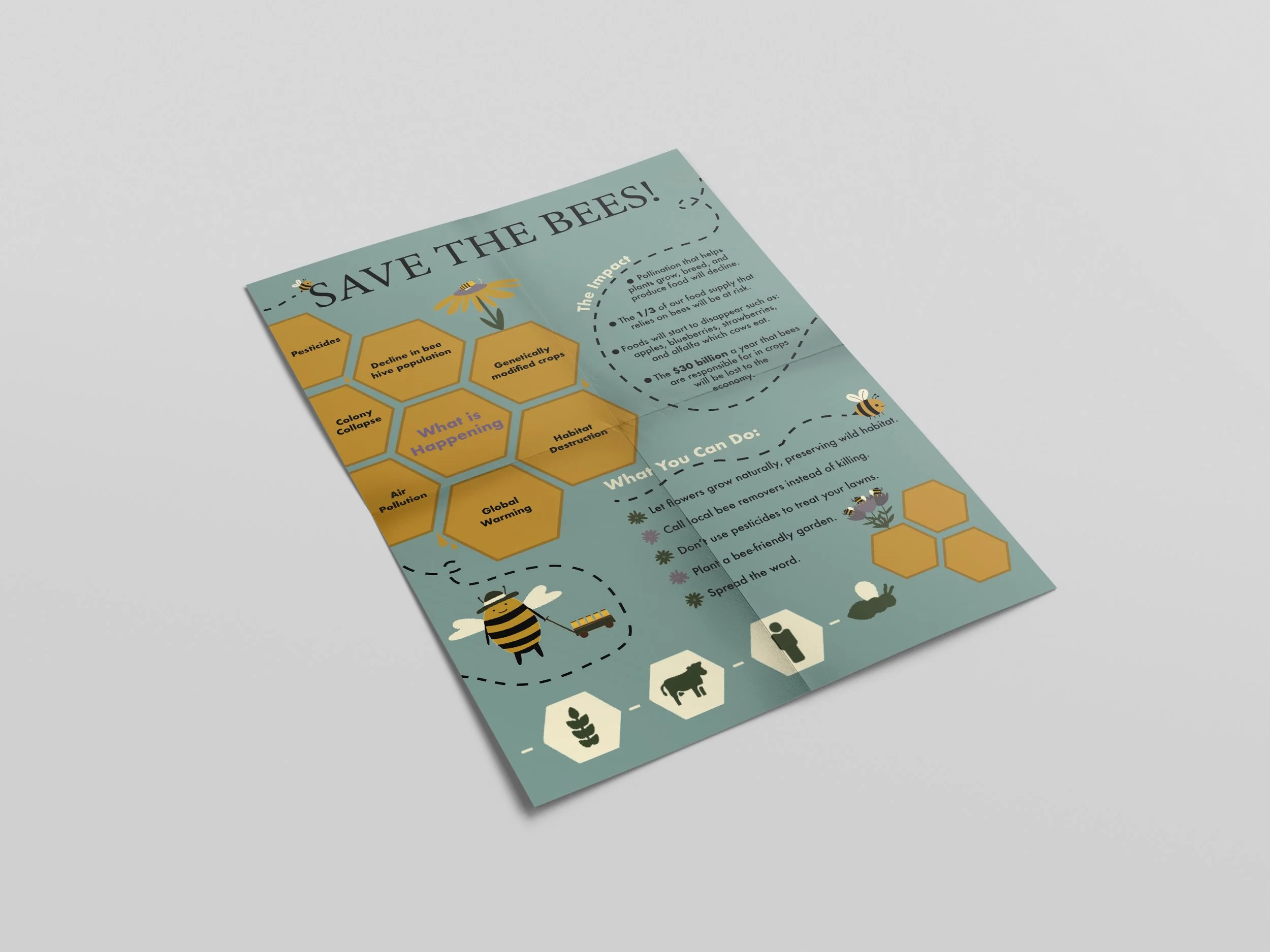 This infographic visually communicates the critical issues facing bee populations, their vital role in our ecosystem, and actionable steps individuals can take to support their recovery. The process behind this project included doing research, creating a color palette, graphics, and putting it all together in Adobe InDesign.